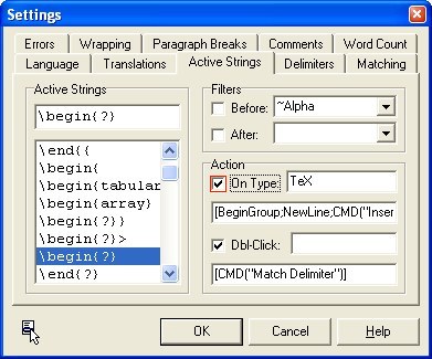 4. Wenn man schon einmal hier ist, kann man gleich noch auf die Karte "Active Strings" gehen und für den String "\begin{?}" das Häkchen vor "On Type" setzen: