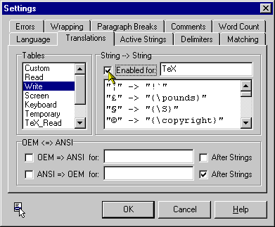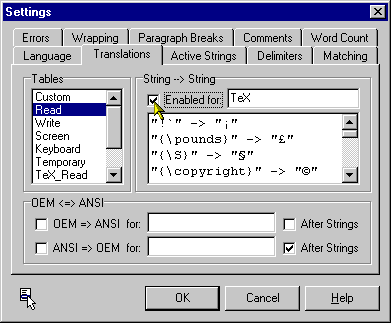 2. Die Karte "Translations" auswählen. Links unter "Tables" den Eintrag "Read" auswählen und dann unter "String --> String" das Häkchen vor "Enabled for TeX" setzen: